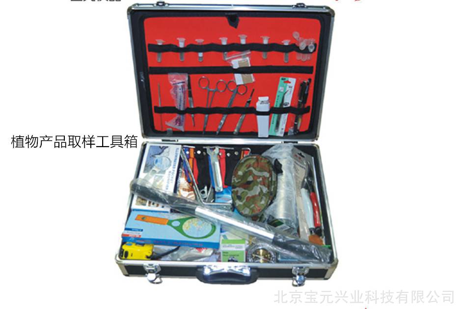 植物产品取样工具箱配置包括:铝镁合金工具箱、取样铲、小尖铲、平头斧、折叠手锯、白托盘、夹书板、不干胶标签、劳保手套、口罩、红色签字笔、黑色签字笔、红色记号笔、黑色记号笔、卫生包、耙子/铲子、宽毛刷、宽毛刷、折叠刀、大镊子、小镊子、窄毛刷、窄毛刷、美工刀、计数器、手电电池/充电器、电子称、电子温度计、强光手电、剪刀、卷尺、喷雾瓶、果枝剪、放大镜、大凿子25mm、小凿子10mm、10mL离心管、五金工具包、腰包、5/10/12号塑料样品袋、拖车。 ;植物产品取样工具箱/口岸检疫植物取样箱BY-ZQ01